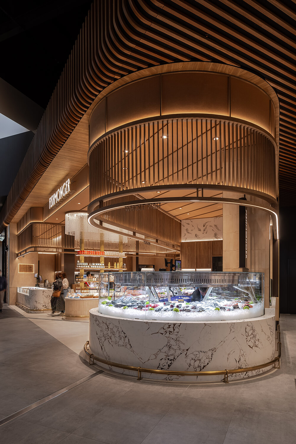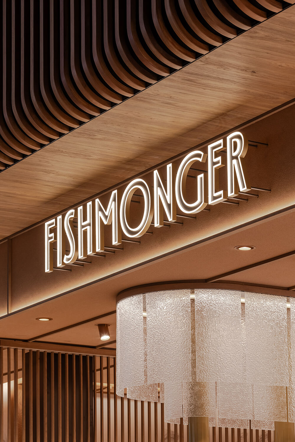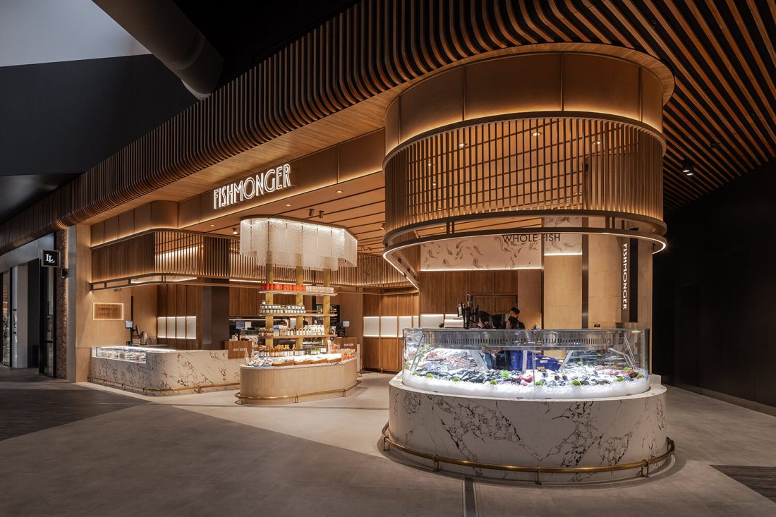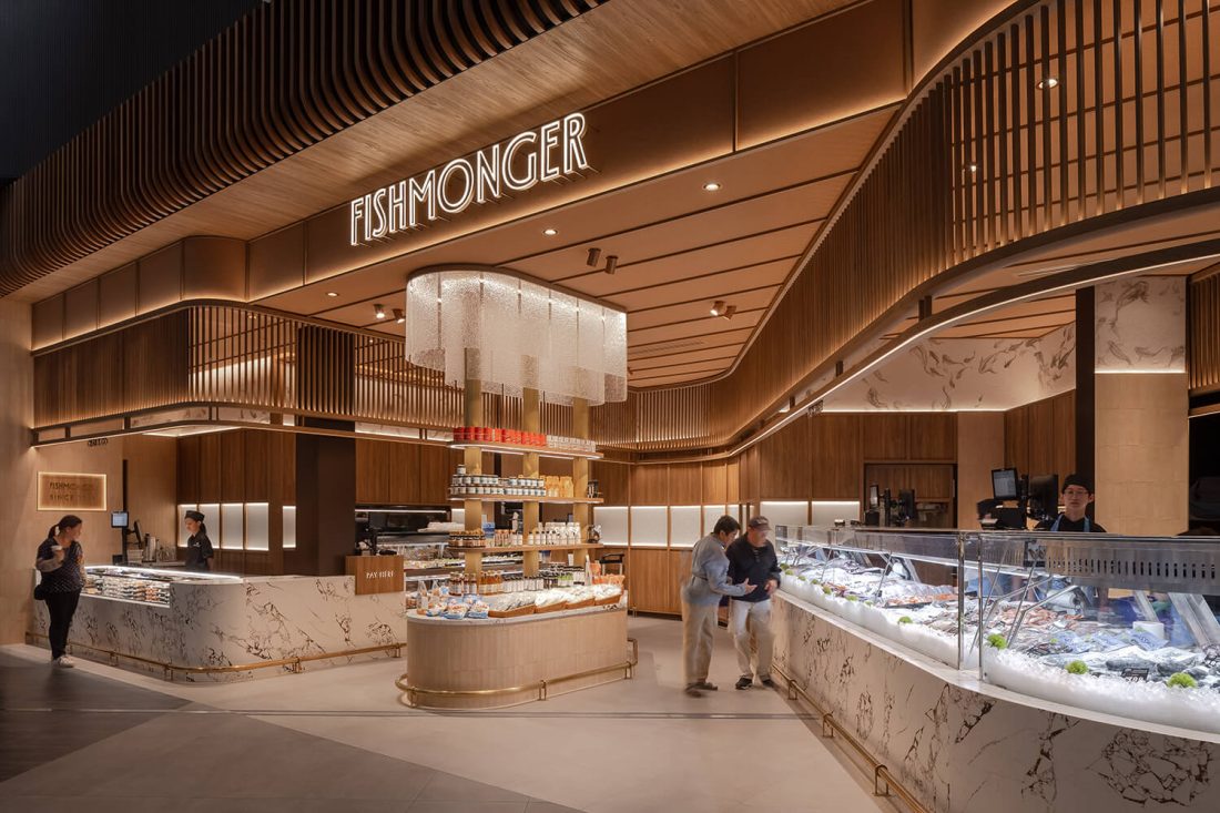 Fishmonger Chadstone distills the essence of oceanic abundance into a sculptural retail experience. Curved marble counters ripple like shorelines, while a rhythmic canopy of timber battens evokes the undulating sea. Layered lighting and artisanal detailing create a sensorial journey—where freshness, form and function converge in a choreography of contemporary luxury.