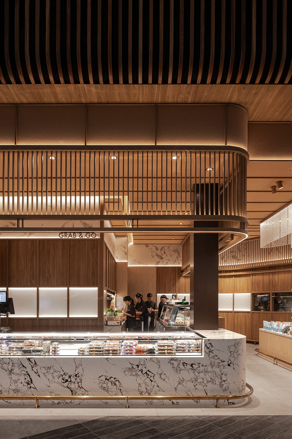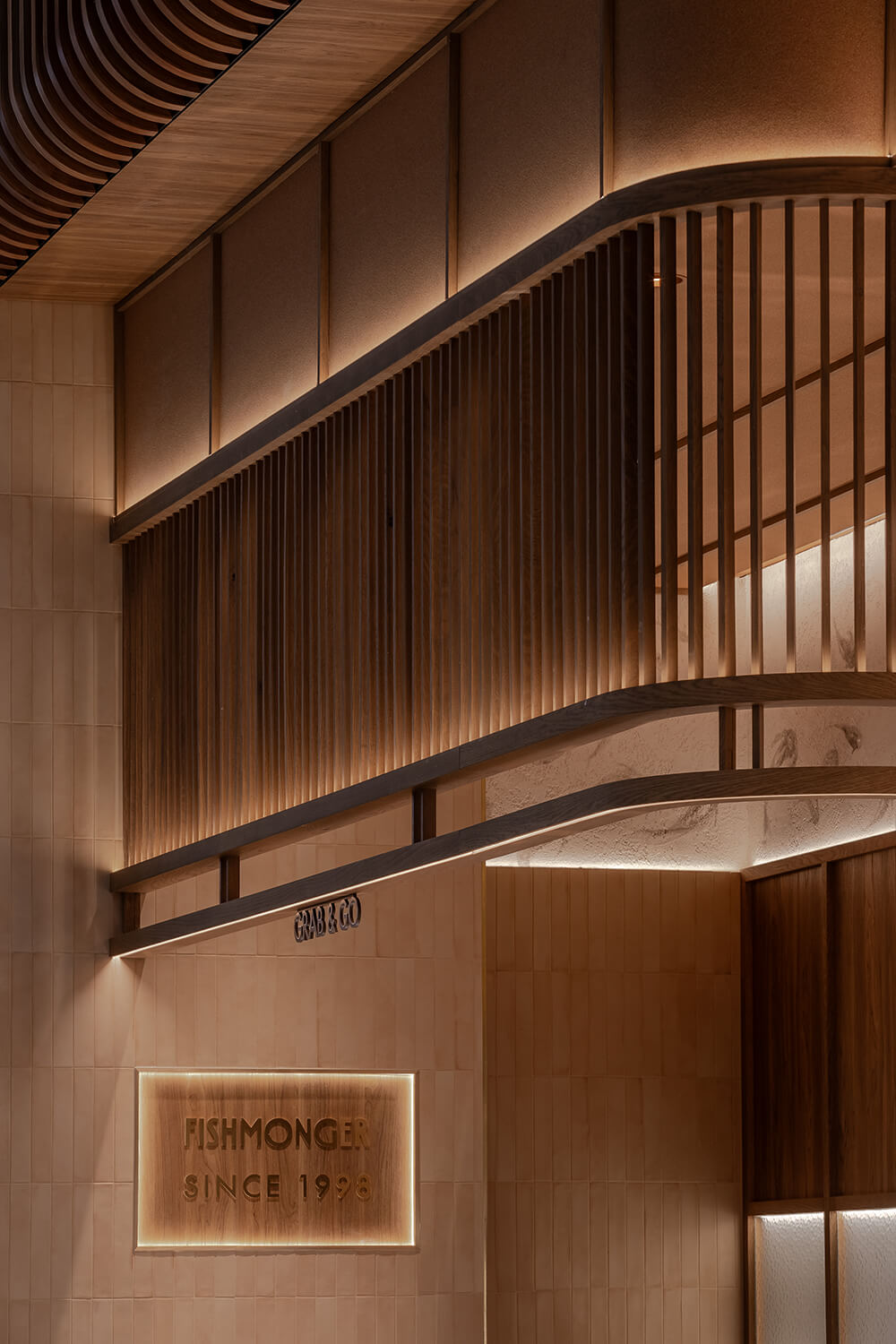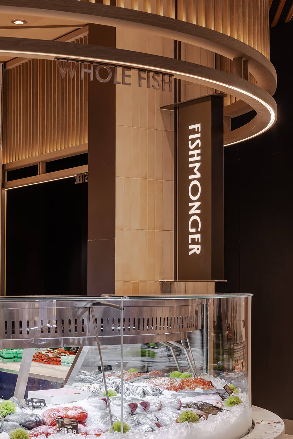 Fishmonger Chadstone distills the essence of oceanic abundance into a sculptural retail experience. Curved marble counters ripple like shorelines, while a rhythmic canopy of timber battens evokes the undulating sea. Layered lighting and artisanal detailing create a sensorial journey—where freshness, form and function converge in a choreography of contemporary luxury.