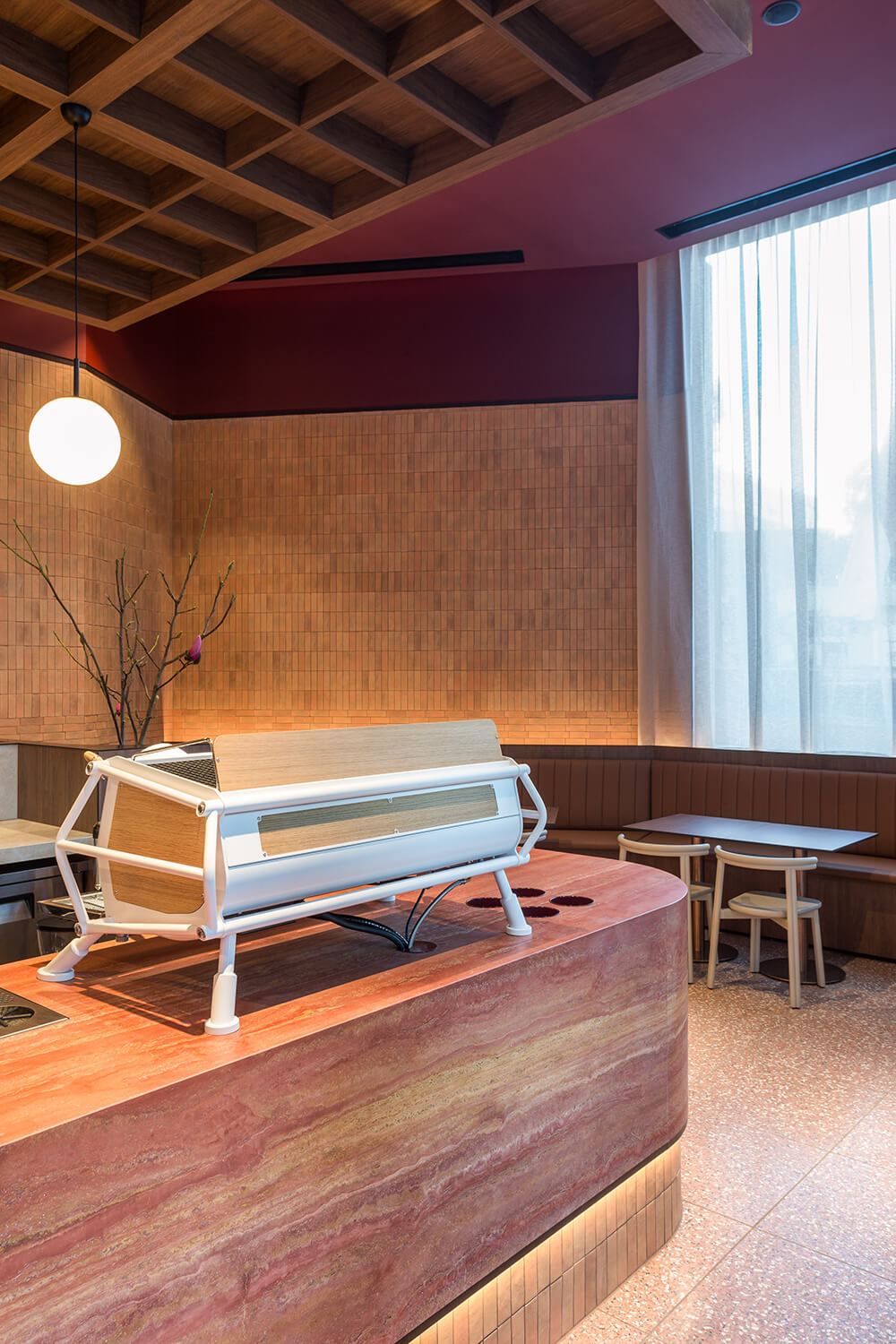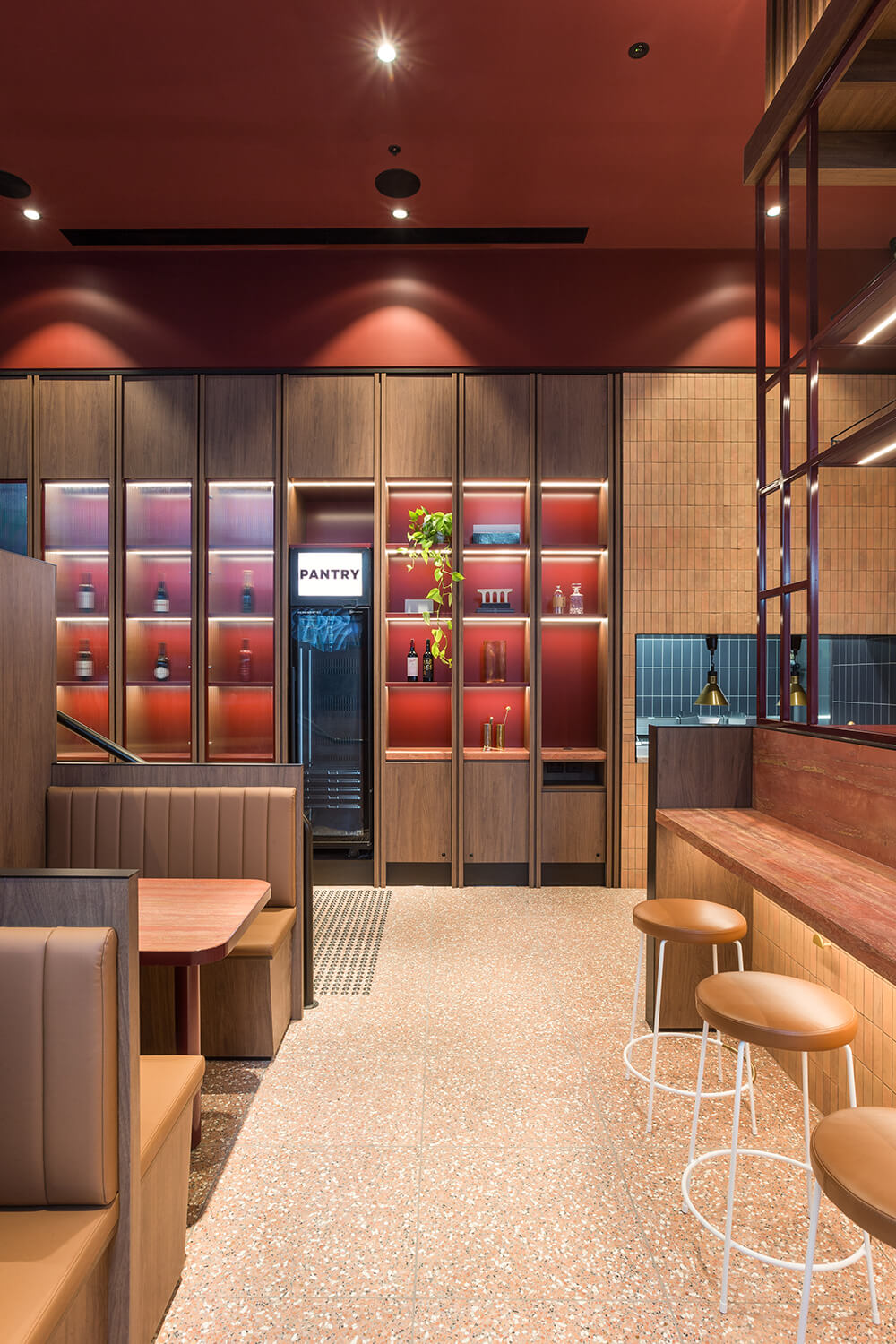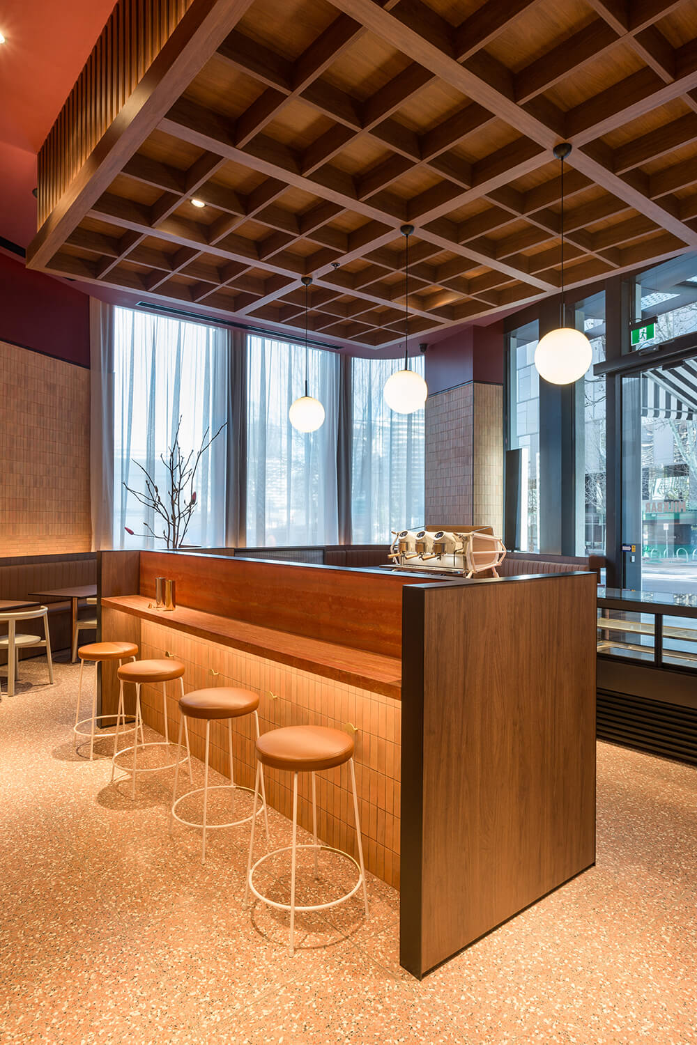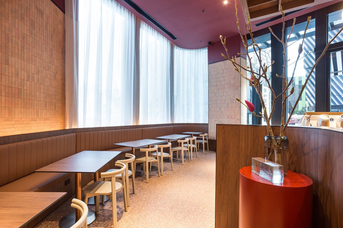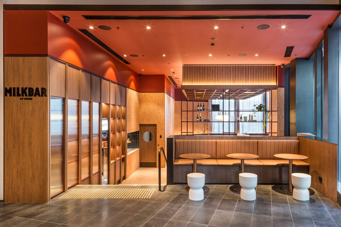 Milkbar Docklands reinterprets the classic suburban milk bar as a refined hospitality and retail hybrid. Nestled within a high-profile residential lobby, the design uses terracotta hues, warm timber, and a sculptural ochre stone counter to create a cohesive colour-driven identity — simultaneously embedded in context and distinct as a standalone destination